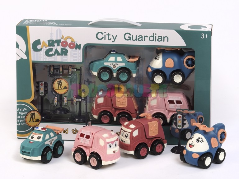 Incluye un coche de policía, un camión de bomberos, una ambulancia y un helicóptero, todos diseñados con ruedas de fricción que permiten un movimiento fácil y sin necesidad de pilas.
